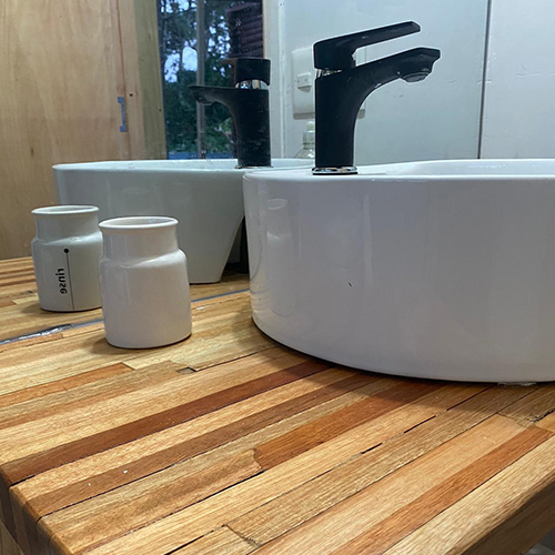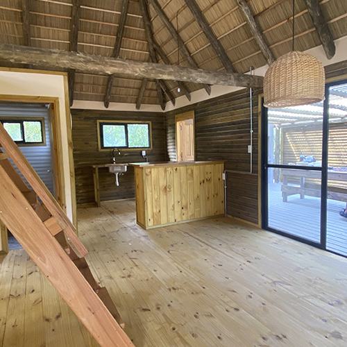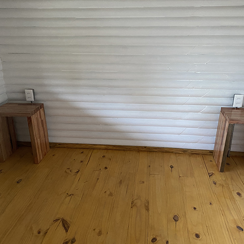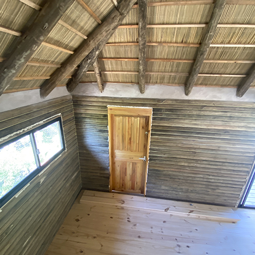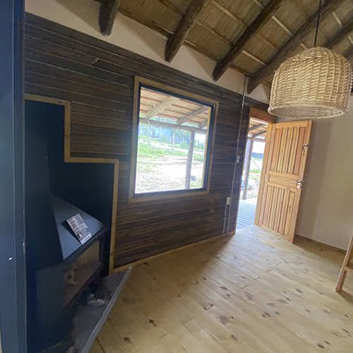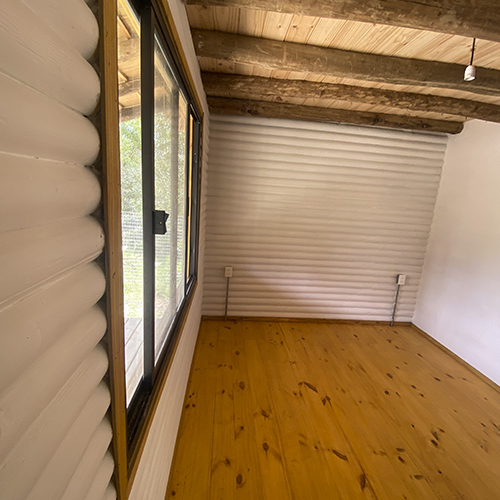 - Pisos de madera de pino sin tratar machimbrado en toda la casa.